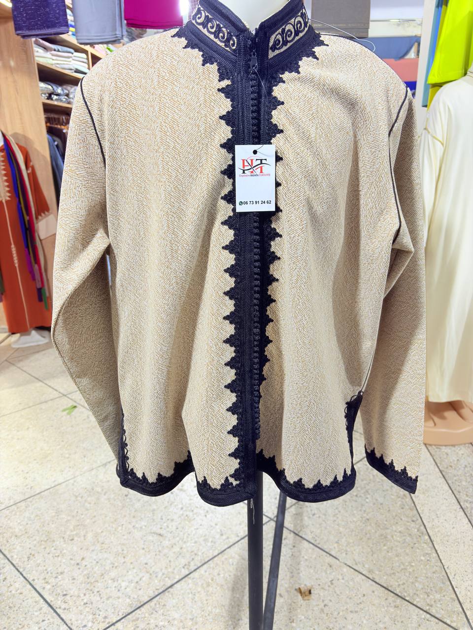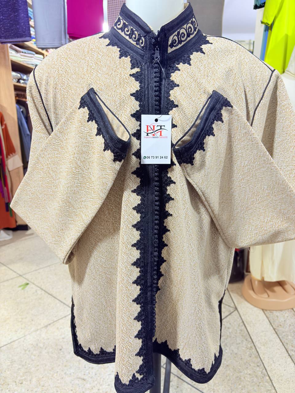 Tunique marocaine traditionnelle pour homme, confectionnée dans un tissu blanc élégant avec finitions artisanales en sfifa rouge et verte. Elle se distingue par une broderie raffinée de la carte du Maroc, symbole de fierté et d’identité nationale.