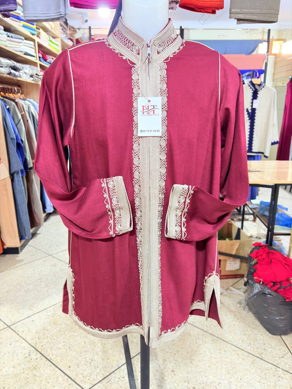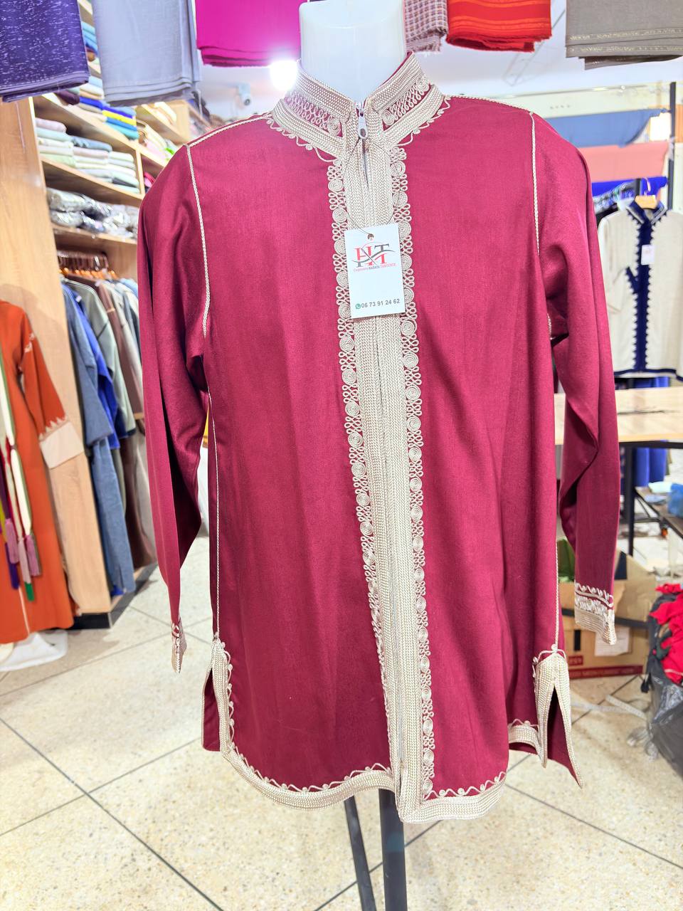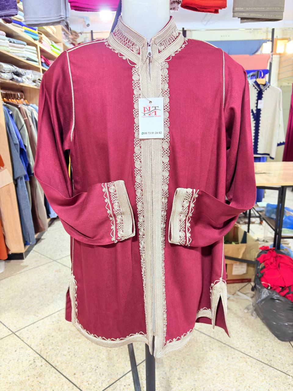 Tunique marocaine traditionnelle pour homme, confectionnée dans un tissu blanc élégant avec finitions artisanales en sfifa rouge et verte. Elle se distingue par une broderie raffinée de la carte du Maroc, symbole de fierté et d’identité nationale.